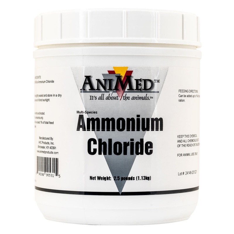 Ammonium Chloride by AniMedAmmonium Chloride contains 99.9% ammonium chloride for goats, and is used to prevent urinary calculi that occurs frequently in castrated male goats as well as bucks. 2.5 lbsDirections for dosing Ammonium Chloride:Add 1 1/2 lb for