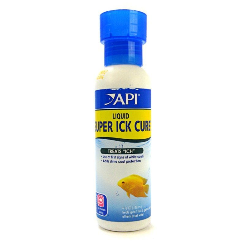 API SUPER ICK CURE fish remedy treats Ich, or white spot disease, in fish, along with other highly contagious parasitic diseases. The Ich parasite has a multi-staged life cycle, and is invisible in its early stages when it burrows into gill and skin tissue, causing severe electrolyte loss and gill damage in addition to promoting secondary bacterial and/or fungal infections.