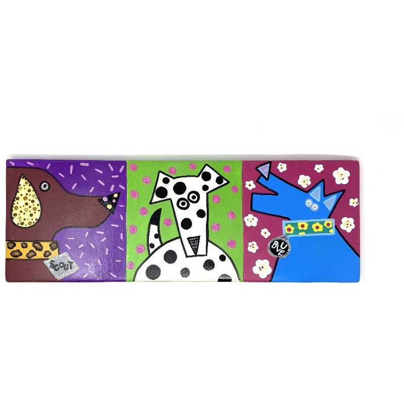 Paintings by Art By Tink!Dimensions:Doggie Party: 10 in x 10 inKitty Party: 10 in x 10 inDoggie Trio: 21.25 in x 7.5 inStay Pawsitive: 7 in x 7 inAnything is Pawsible (A): 15 in x 3.25 inAce and Friends: 12 in x 12 in