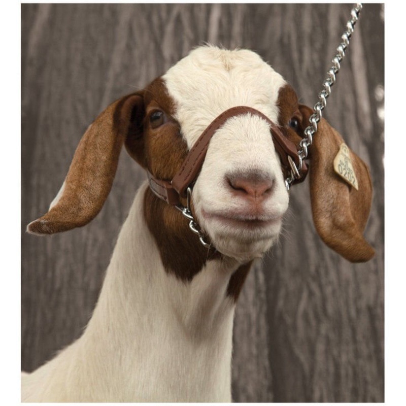 Brahma Webb Goat HalterBrahma Webb Goat Show Halter is a solid chain lead with a snap which allows for quick and easy attachment to a pen or gate. Made of Brahma Webb, this halter wipes and rinses clean.Small Halter: 30 lbs and UnderLarge Halter: 80 lbs an