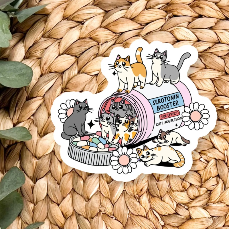 This delightful vinyl sticker by Stickers X Ashley Bexar features a pink prescription pill bottle labeled Serotonin Booster with a cheeky side effect warning: Cute Aggression. Overflowing with colorful capsule pills and a parade of adorable cats lounging, climbing, and spilling out of the bottle, this sticker radiates feel-good vibes and feline charm. Tiny flowers dot the scene, adding to its whimsical and joyful aesthetic. It’s the purr-fect addition to your laptop, journal, water bottle, or any space that needs an instant mood lift.