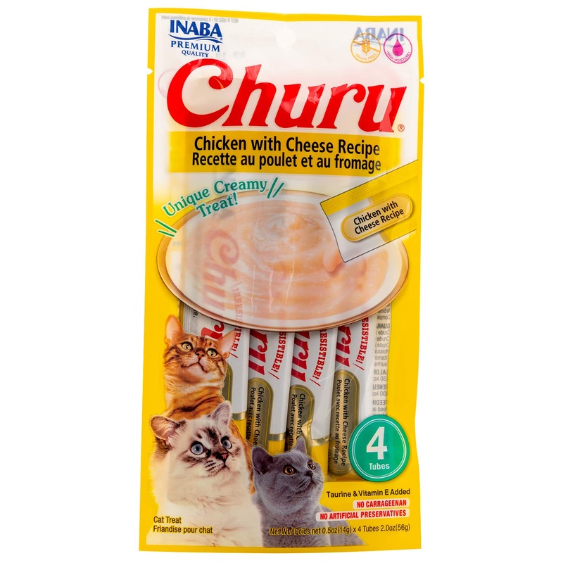 Churu Chicken with Cheese Puree Lickable Cat Treat, 4 pkChuru Purees are tasty, squeezable, low calorie, lickable cat treats made with 100% pure and natural farm-raised chicken. They are high in moisture which felines need for health with no artificial fla