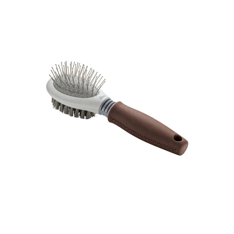 -suitable for long-haired, medium-length and short-haired dogs-soft bristles on one side, nickel-plated pins on the other-flexible brush neck-ergonomic handle with high-quality leather look