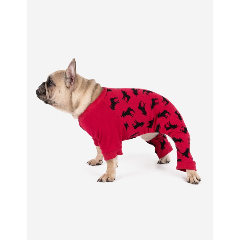 The Dog Cotton Moose Pajamas are perfect for any festive seasons, or having your pup lounge around the house in style. Every product is made from 100% cotton to add extra comfort for playing or napping. Its design features a light red print with black moose across the back and front of the pajamas. In addition to its outside labels, the four holes for each paw and open bottoms allows your pet for easy relief. For photo shoots, match easily with additional festive options for the other family members! Dog Cotton Moose Pajamas are machine wash cold inside out, and have sizes from X-Small to XXX-Large. Since cotton is known to shrink, sizing up could be viable if your pet wishes to be in a more loose outfit. These black and red moose are destined to help create those wonderful family photos during Christmas, or any other special event!