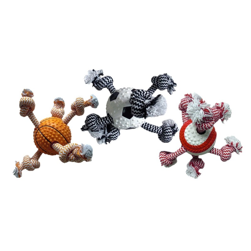 Doglucent TPR Ball with Rope Dog Toy, 9", AssortedThe Doglucent TPR Ball with Rope is a fun and durable 2-in-1 toy designed to engage even the toughest chewers. Each toy features a rugged sports-themed TPR (thermoplastic rubber) ball paired with six knotte