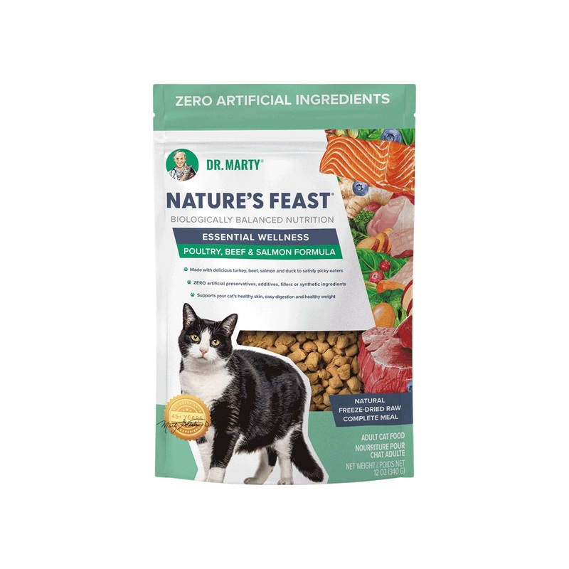 Freeze Dried Cat FoodDr. Marty Natures Feast Essential Wellness is a premium freeze-dried raw cat food crafted to support overall feline health. Available in Fish & Poultry, Poultry, and Poultry, Beef & Salmon, each recipe features real cuts of protein-ric