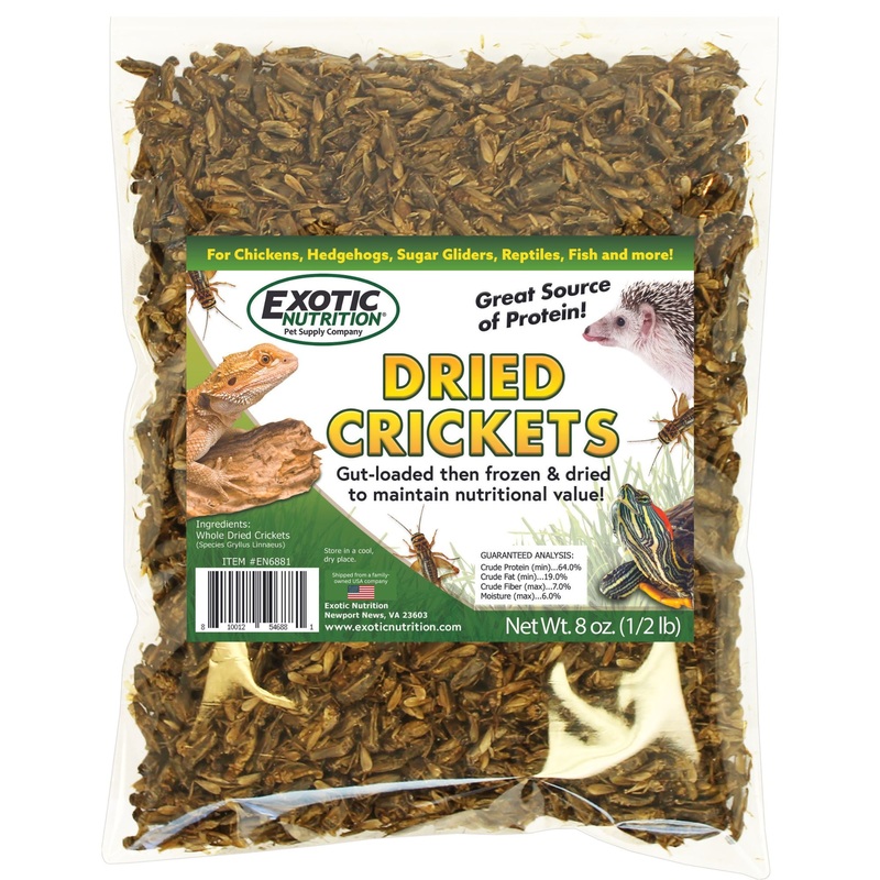 Exotic Nutrition's Dried Crickets 8 oz. are gut-loaded dried crickets that are first frozen, then freeze dried to maintain their nutritional value. A great source for protein ... and they store for a year or longer without refrigeration. Excellent for Suga