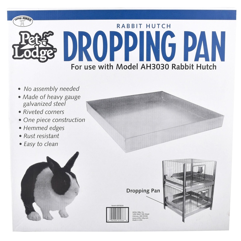Dropping Pan, 30" x 30"This Dropping Pan is made from heavy-duty galvanized steel with riveted corners and hemmed plastic edges. Pan pulls out for easy cleaning and is fully assembled.Fits Pet Lodge Rabbit Hutch (ITEM# M31P).