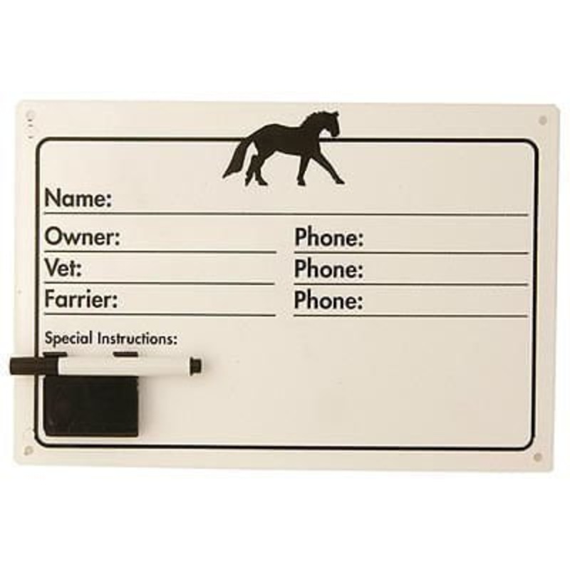 Dry-Erase Horse Nameplate Set, EachProvides horse's name, owner's name and phone number, vet's name and phone number, farrier's name and phone number, plus a section for special instructions. Complete with a dry erase marker.