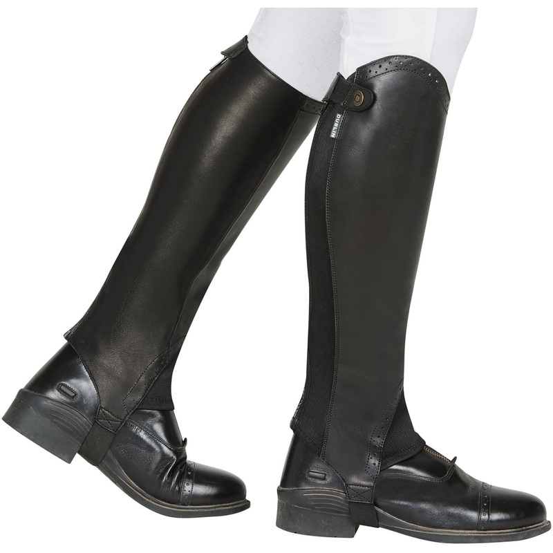 Dublin Evolution Rear Zip Half Chaps, BlackMade from soft full-grain European leather. An elastic calf provides an ideal fit. YKK rear zipper for strength and reliability. Top features a pin puncture detail to add subtle style.Easy clean. Simply wipe off.