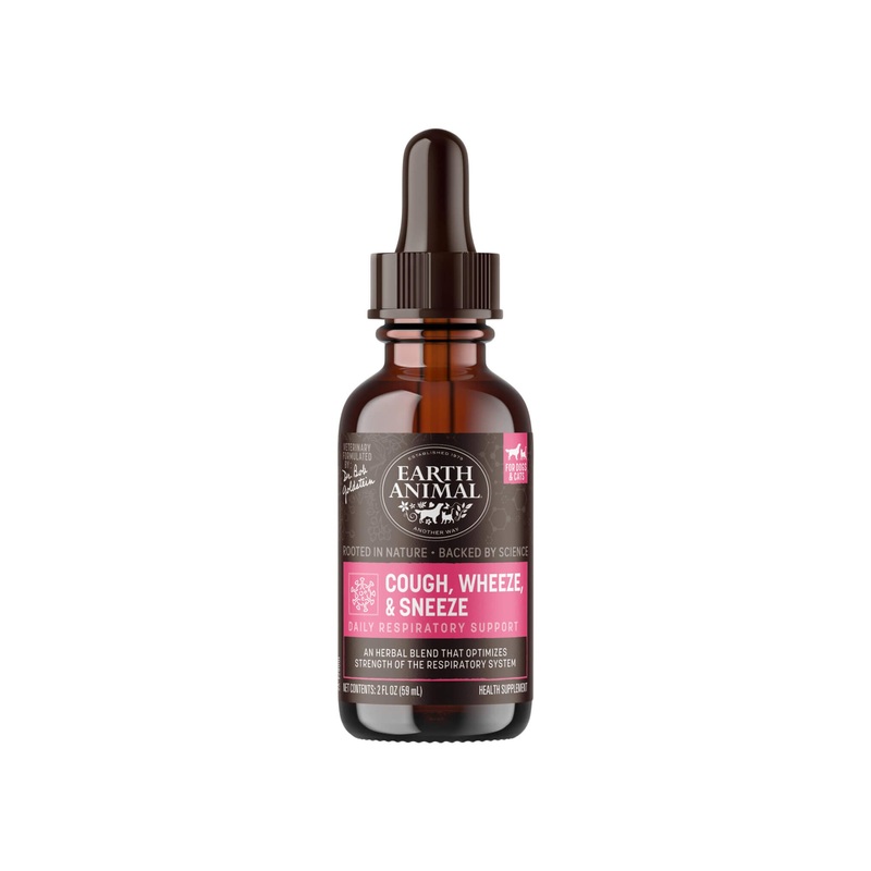 Earth Animal Organic Herbal Remedies Cough, Wheeze & Sneeze Tincture for Dogsoffers another way to healfor pets whoare prone to seasonal allergies. Infections, coughing, wheezing, & sneezing are also common during stressful times. This organic herbal blend supports respiratory function & health and enhances oxygen utilization.