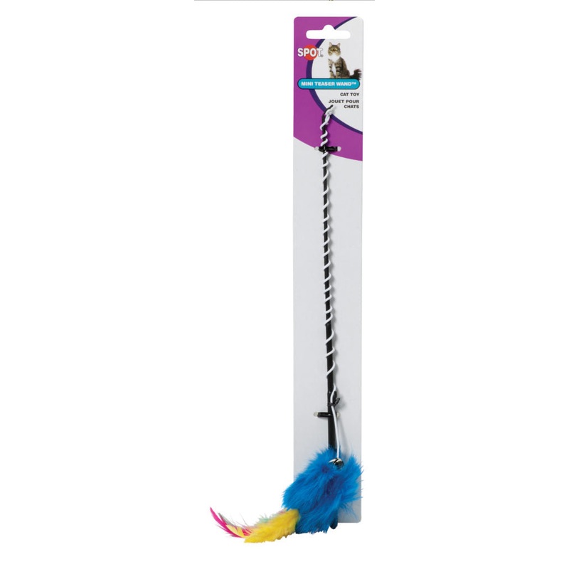 Mini teaser wand is perfect for interactive play time. 12 in length, fun enticing interchangeable toys will tempt kitty to swat and pounce!