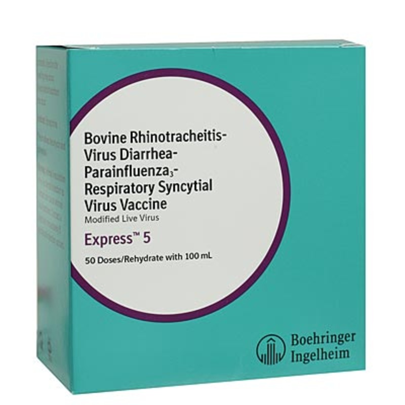 Express 5 Cattle VaccineIBR, BVD Types I & II, P13, BRSV (MLV)Sub-Q approved.Inject 2 mL IM or SQ. Repeat in 14-28 days and once annually.Calves vaccinated before 6 months of age should be revaccinated at 6 months. A 2 mL booster is recommended prior to ti