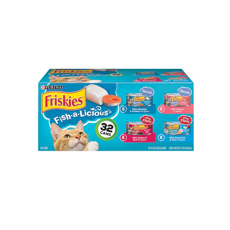 FRISKIES FISHALICIOUS VARIRTY 5.5z 32CTProduct detailsPurina Friskies Fish-A-Licious Wet Cat Food Variety Pack, Keep your inquisitive cat wondering what's in her dish at mealtime with a Purina Friskies Fish-A-Licious wet cat food variety pack. Premium sele