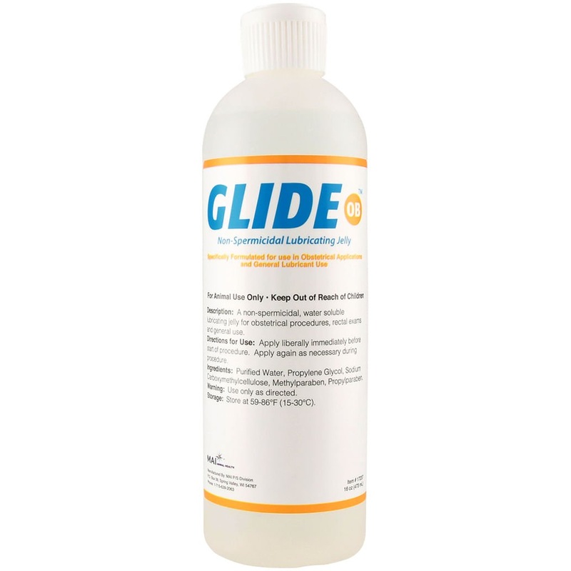Glide Greaseless Lubricant, 16 ozNon-irritating, greaseless lubricant for hand, arm, and instrument use when performing obstetrical or rectal examinations.Benefits:Minimizes irritation to the users skin and animal mucous membranesUsed in artificial insemin
