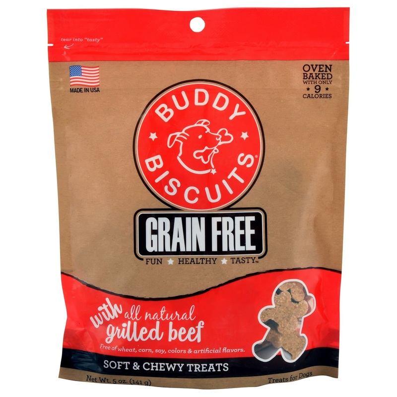 Grain Free Buddy Biscuits, 5 oz Soft and Chewy TreatsAll of the taste, none of the grain! 100% grain free & gluten free Buddy Biscuits. Perfect for dogs that are on a grain free diet. Yummy, craveable flavors will delight dogs as well as their parents with