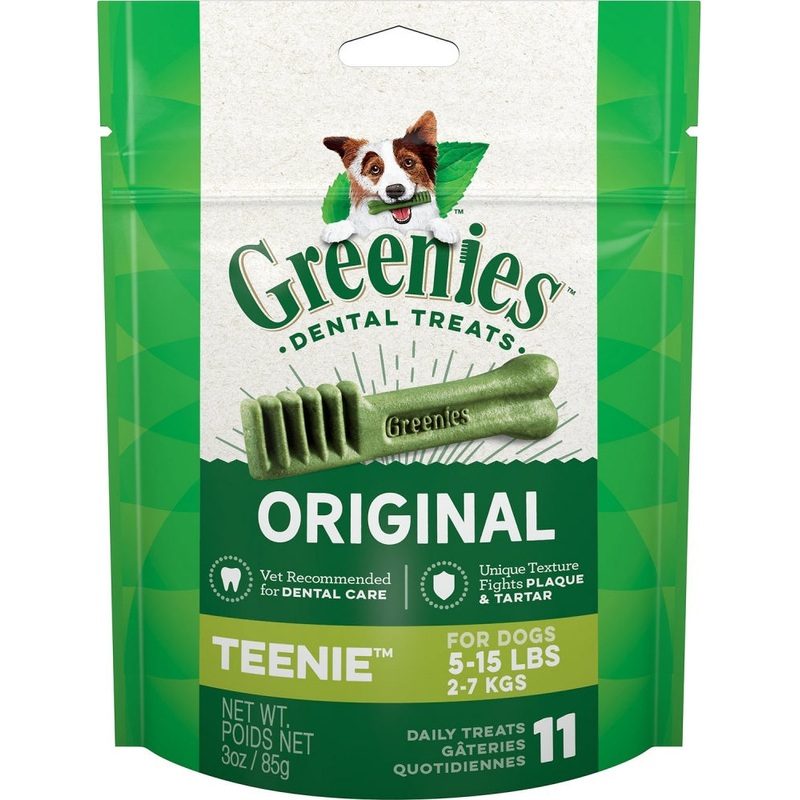 Made with a chewy texture to help fight plaque and tartar, Greenies Teenie Original Dental Dog Chews are the perfect daily treat to help keep your pups teeth clean! These dental treats are all natural with easy to digest ingredients topped with a delicious, mouth-watering taste!