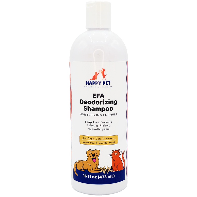 Happy Pet EFA Moisturizing & Deodorizing Shampoo is a gentle, soap-free treat for your furry friends! With a sweet pea and vanilla scent, its perfect for dogs, cats, and horses who need a little extra love. Packed with emollients to keep skin soft, protein
