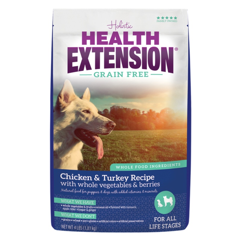 Prepared with delicious, whole food ingredients, Health Extension Grain Free Chicken & Turkey Recipe is packed with every nutrient canines need to thrive. Organically raised chicken is the first ingredient, so you know your pet is getting healthy levels of
