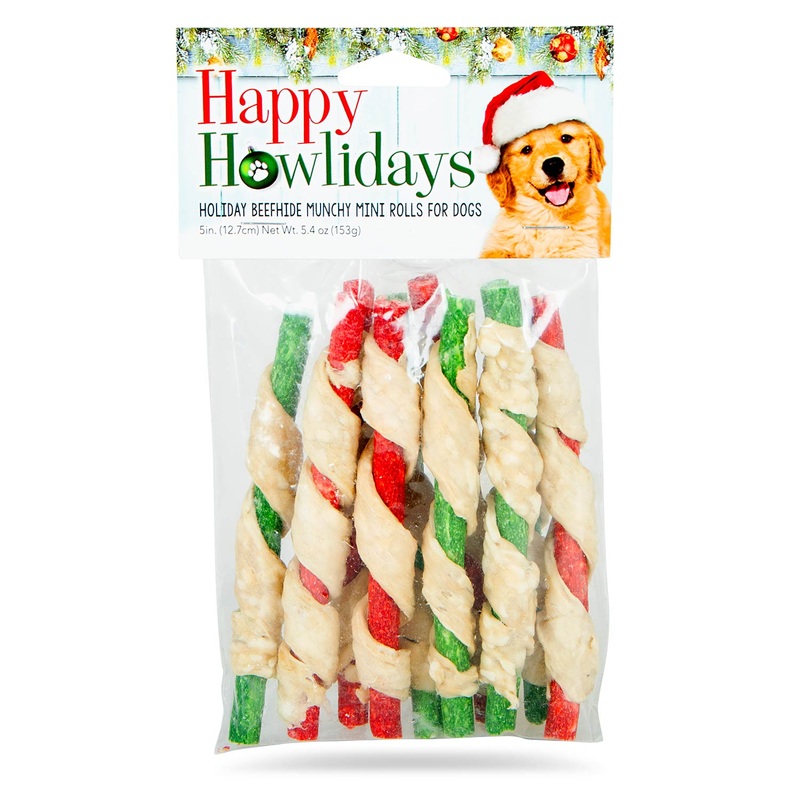 Holiday Munchy Mini Rolls Dog Chews, 10 CountThese Holiday Munchy Mini Rolls from Pet Factory make the perfect stocking stuffer for your dog this holiday season! Easy to chew and digest.Approximately 5" long. 10 pack.ALWAYS supervise your pet with ANY trea