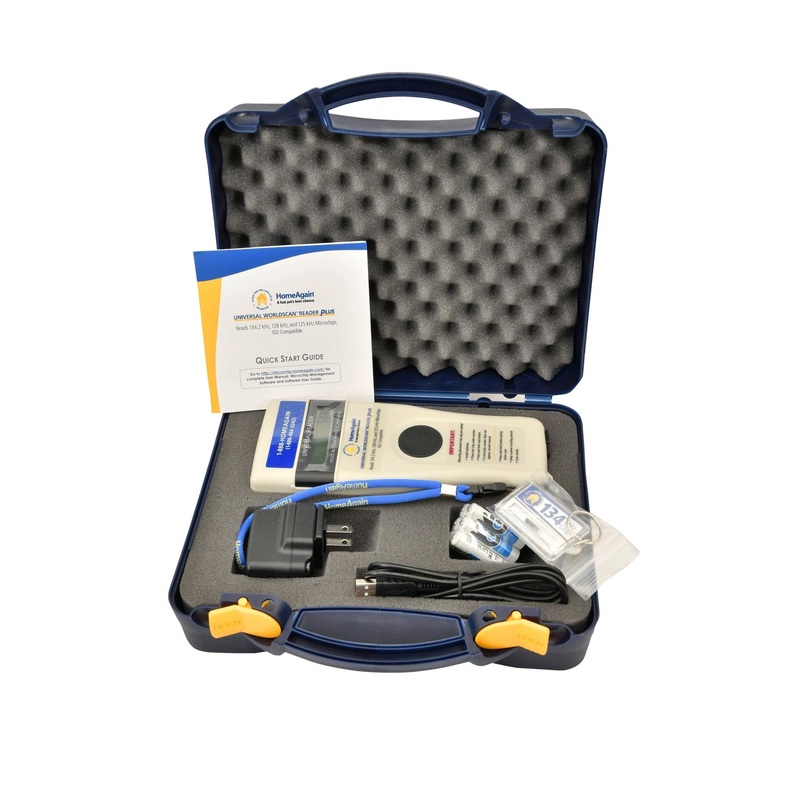 The HomeAgain Pocket Reader scanner by Digital Angel Corp. comes with 4 AAA alkaline batteries, 1 test microchip, and an operator’s manual. The Universal Worldscan handheld scanner reads all frequencies (134 kHz, 128 kHz, and 125 kHz chips).