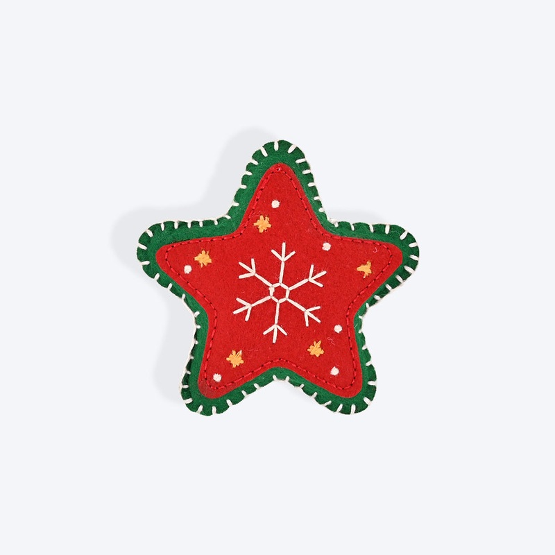 Made from Polyester, this collar insert comes in the festive hues of red, green and white. There is a snowflake embroidered on the collar insert. To give it a padded look, the star is filled with soft polyfill. The collar insert has an elastic loop at the back which makes it easy for you to slip it into any collar.