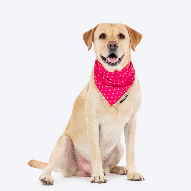 Bring home a burst of colour and cheer with the HUFT Desi Glam Knot Bandana for dogs in pink! Crafted from soft poly brocade and edged with golden lace, its a little nod to festive traditions made just for your four-legged family member. The easy knot-tie design adjusts to fit comfortably, so they can strut, snooze, or snack in style. From Diwali lights to paw-rties, this bandana is ready for every wag-worthy occasion.
