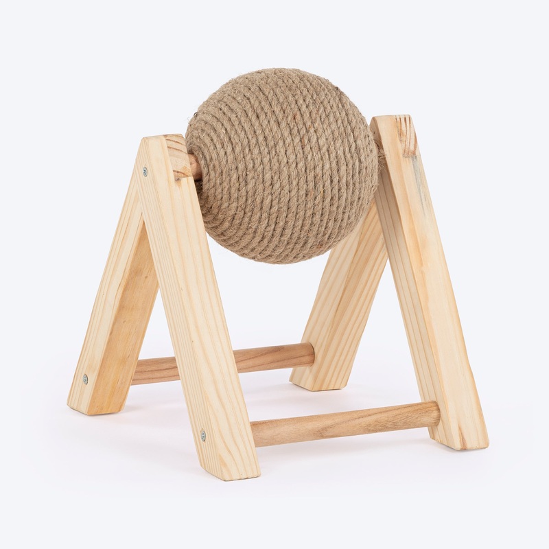 The Pawplay Scratcher is made for enriching playtimes! The sturdy wooden structure features a rotating ball on top of it. Made with natural jute fibres, hand woven by local artisans, it provides the ideal texture for cats to claw and scratch at. Not only does it help them sharpen their claws in a healthy way, it also gives them a mentally stimulating exercise to do. Clawing at it helps them relieve stress and anxiety, and protects your furniture from unwanted scratches.