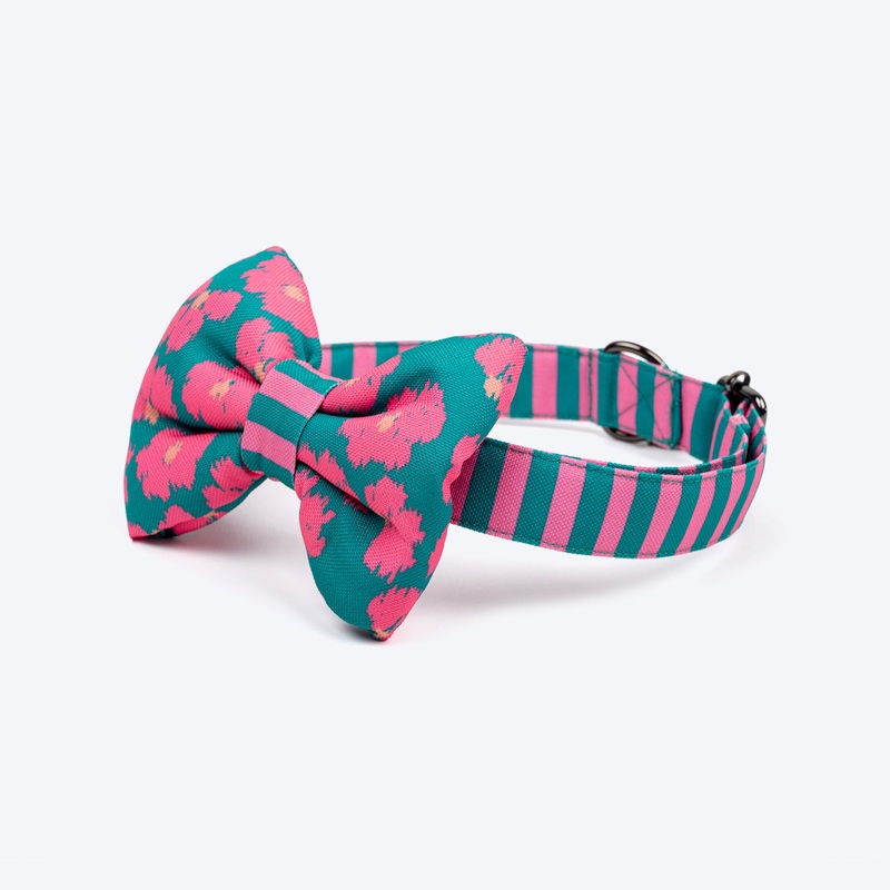 Let your dog’s style shine with our Pawsome Blossom collar and bow tie set in green and pink! Crafted from soft, pet-safe fabric, this collar features a charming mix of floral and striped patterns that perfectly blend functionality with fashion. The detachable bow tie adds just the right touch of flair for every activity. Designed with an easy buckle closure and adjustable strap, it ensures a secure, comfortable fit your dog will love. The D-ring provides reliable leash attachment, while the delicate dangling logo charm adds that final polished detail.