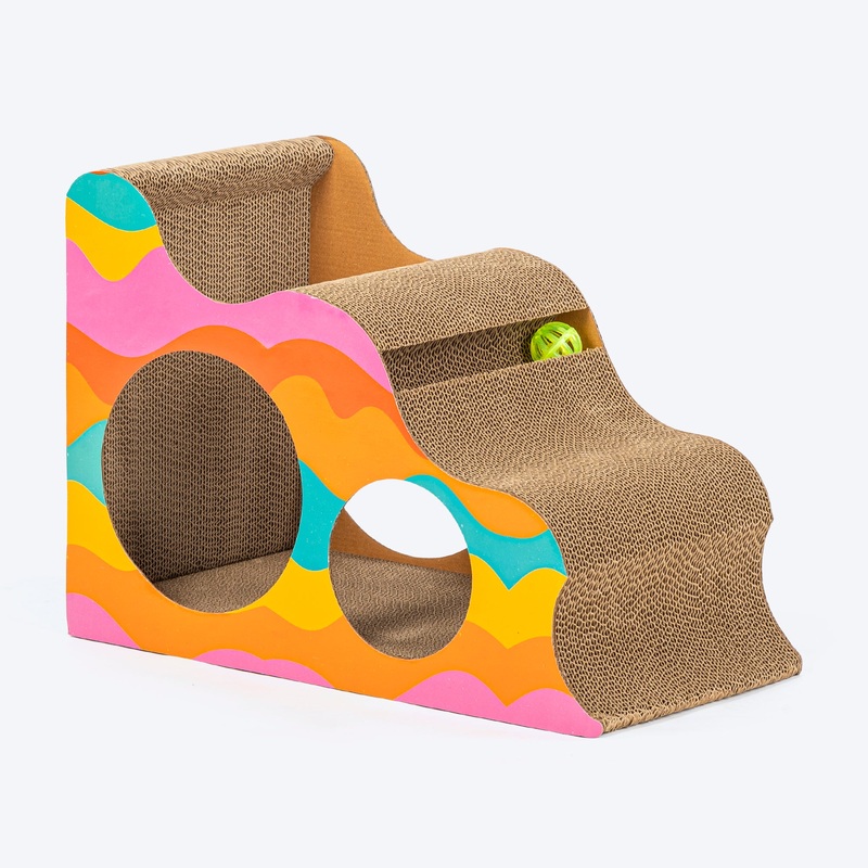 Cats can be timid and anxious sometimes. If you often find scratches and claw marks everywhere, or see them hiding under furniture, it might be a sign. Keep your furry one engaged, entertained and feeling safe with the Scratch ‘N Hide Scratcher. Made with 100% recycled and biodegradable corrugated paper, the eco-friendly textured surface offers the ideal texture for scratching and clawing-keeping their nails healthy and away from your furniture and floors. Clawing is a natural way for cats to relieve stress, and the catnip that comes along with this scratcher and the bell ball inside the passages adds to the mental and physical stimulation. The unique design allows your cat to hide comfortably and take some me-time! So let this multicoloured scratcher be a playful addition to your home, and a playtime essential for your cat!