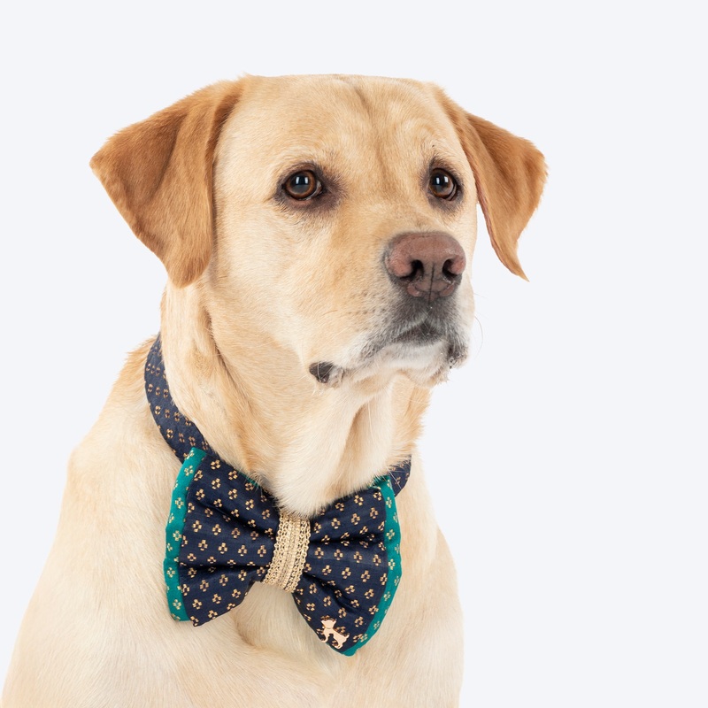 Celebrate every wag and wiggle with the HUFT Shahi Paws Bow Tie With Strap for Dogs in blue and green! With its vibrant brocade fabric and glimmering golden lace, its the kind of accessory that says paw-rtys here! as your pet walks in. The adjustable strap and secure buckle closure keep them comfy through all the excitement. From the brightest celebrations to the simplest family get-togethers, this bow tie turns every moment into a tail-wagging occasion.