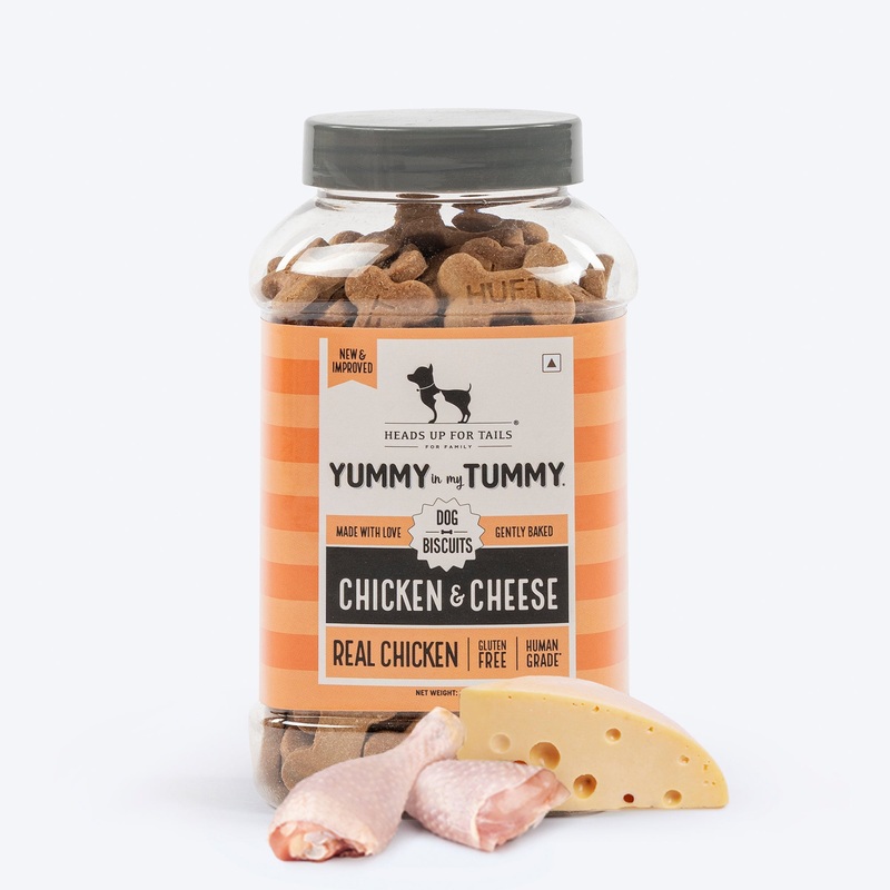 Your search ends here! Health meets taste in the new and upgraded recipe of gluten-free Yummy In My Tummy dog biscuits. Unlike other dog biscuits, ours contain no artificial flavouring or colours, harmful maida (refined flour) or processed sugar. These biscuits are made with only 100% real, human-grade ingredients like chicken, cheese, oat flour, rice flour and jaggery, along with lots of love and care!