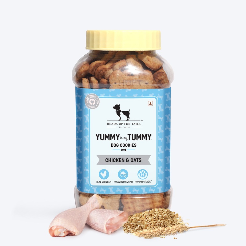 Your search ends here! Health meets taste in HUFT Yummy In My Tummy dog biscuits. Unlike other dog biscuits, ours contain no artificial flavouring or colours, harmful maida (refined flour) or processed sugar. These biscuits are made with only 100% real, human-grade ingredients like fresh chicken, slow-dried chicken liver powder, oats, atta (whole wheat flour) and rice flour, along with lots of love and care!