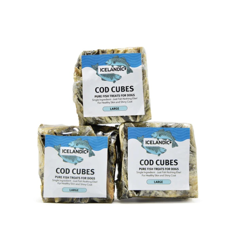 Our 100% natural and edible Icelandic Cod SkinLarge Cube is a single ingredient dog treat and contains no additives, preservatives or supplements. The Large Cube is dense and is a bit larger than 2″x 2″x 2″ (6cm x 6cm x 6cm) They come only from the pure icy waters of Iceland and are line-caught daily and processedimmediately. Not only are they delicious for your dog, they reduce tartar and plaque build-up for healthier gums and teeth. They are also a great natural source of Omega-3 fatty acids, promoting healthy skin and coat for your pet. With just one ingredient, these tasty and healthy treats are perfect for dogs with protein sensitivities. Our natural and edible fishproductsoffer peace of mind, as they are cleaned and air-dried within FDA, USDA, EU, and MAST standards and regulations. Because Iceland almost never gets warm, our fish always remain cold after being caught. As a result, they have less smell than other fish treats in the market.