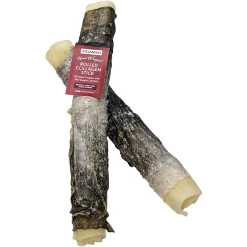 Icelandic + Rolled Collagen Hand Wrapped Fish Sticks Keep your pup healthy and entertained with 100% natural collagen chews packed with incredible flavor and nutritional benefits. Naturally occurring glucosamine, chondroitin, and omega-3s help support heal