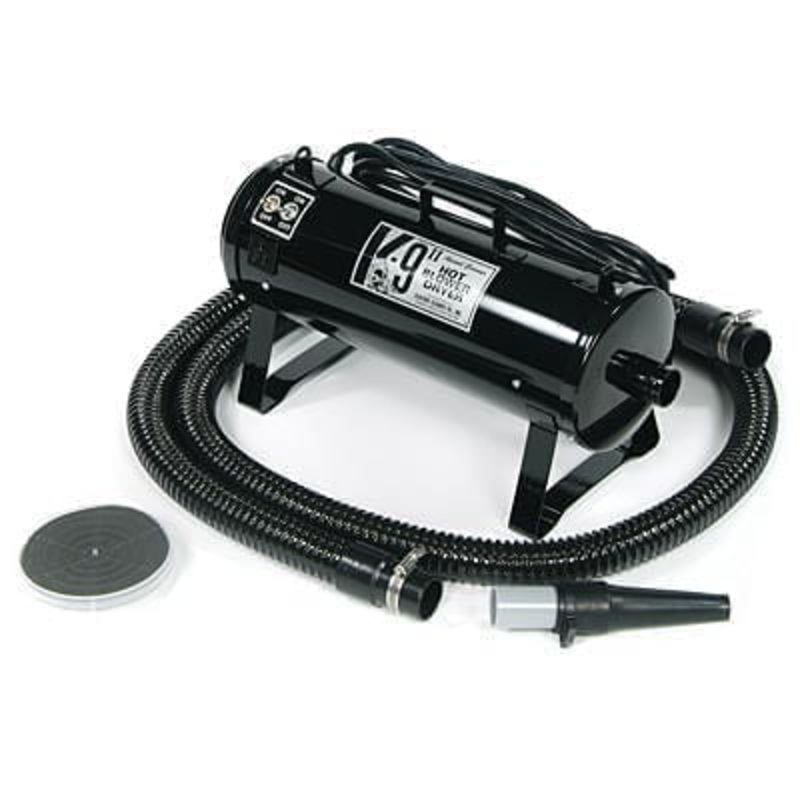 K-9 II GroomerLightweight but sturdy, portable blower/dryer for dogs.Features:choice of two speeds and temperatures18 gauge powder coated steel body120 V, 18.5 amps58,239 FPM218 CFMs120 V utility outlet for clippers2-year warranty on both motors90-day warr
