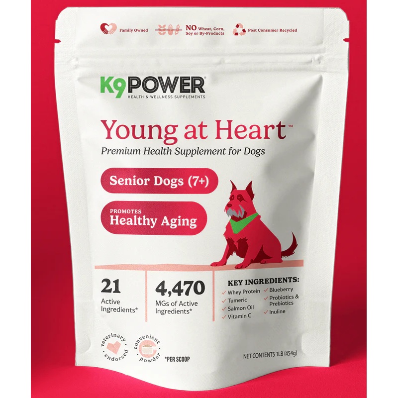 K9 Power Young at Heart is a formula designed to give your senior dog the necessary metabolites to keep their body going strong and functioning properly. As the dog ages, its organ systems become less efficient in metabolizing nutrients and there often is need for functional ingredients that will maintain or enhance the health and well-being of the dog. The desire of all dog owners is for them to live a long life, but yet a quality life as free as possible from the various morbidities that can result from advancing age. Our Young at Heart supplement is designed to do just that. With a balance of key functional ingredients, Young at Heart promotes healthy aging with an emphasis on joint, vision, heart, ocular, digestion, and immune health. Formulated for dogs 6 months of age and older.