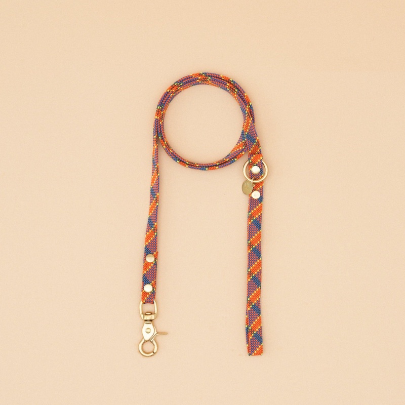 Wow the neighborhood with our flat rope leash in Orange – a multicolor pattern of orange, yellow and blue – featuring polished brass hardware. A lighter leash designed for smaller dogs including puppies, minis and toys!
