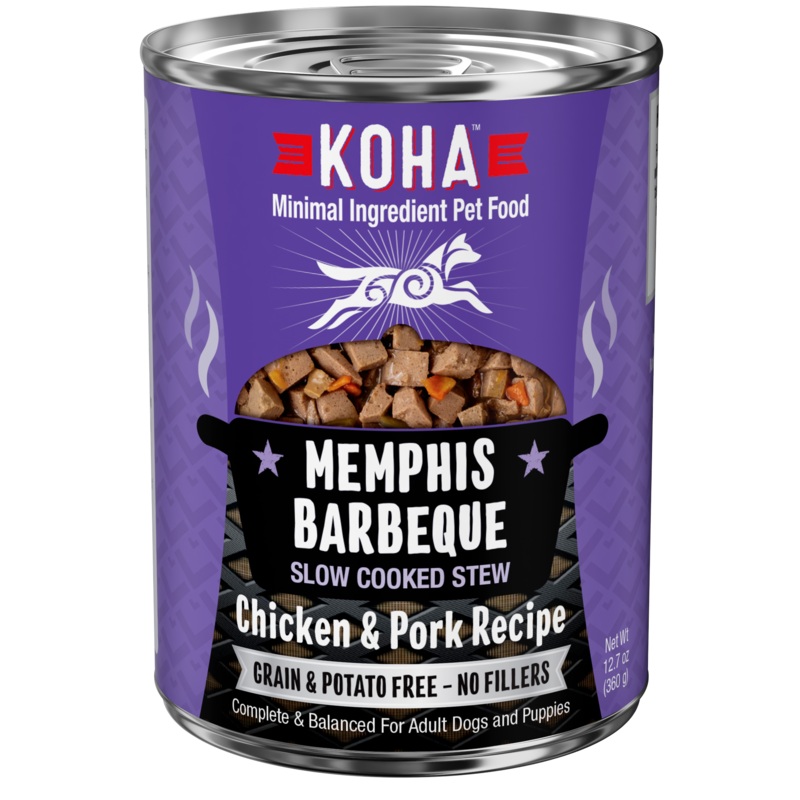 KOHA Memphis Barbeque Slow Cooked Stew provides a nutritious high-quality protein combination that is grain, potato, and carrageenan free. Dogs rock n roll to the savory taste of tender chicken and pork. Feed as a complete and balanced meal or as a topper.