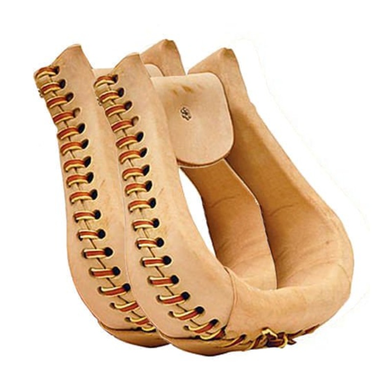 Leather Bell Bottom StirrupsThese Leather Bell Bottom Stirrups combine style and functionality, with a durable nylon base and laced leather skirting. The bell bottom design offers extra stability and comfort, while the high-quality materials ensure long-la