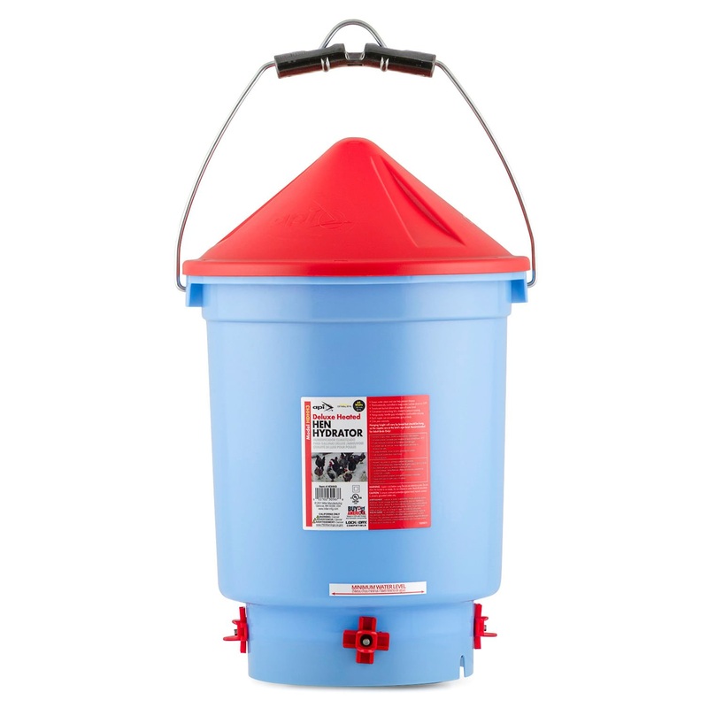 Heated Deluxe Hen Hydrator, 3 galThis easy to fill Deluxe Heated Hen Hydrator provides access to clean water on demand while keeping it ice free up to -10F. The translucent bucket was designed to provide UV protection to prevent algae growth and allow for
