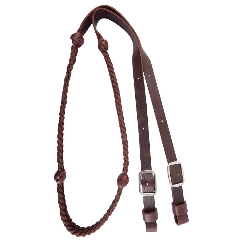Martin Saddlery Braided 5-Strand Barrel Rein with Knots 7/8-inch Thick Buckle Ends Performance and longevity were in mind when these reins were designed. This barrel rein features a 5 plait latigo leather braid and braided knots, finishing out to a 7/8-inc
