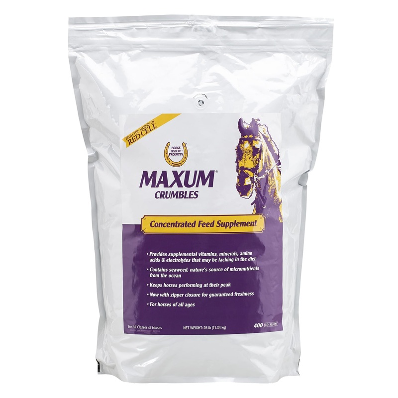 Maxum CrumblesConcentrated supplement formulated of vitamins, chelated minerals, amino acids, kelp and electrolytes needed for maximum growth rate of foals, for mares during gestation and lactation and for breeding stallions. Benefits:Improves feed efficie