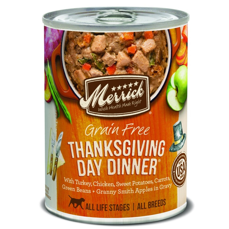 Merrick Grain Free Thanksgiving Day Dinner Canned Dog Food brings all of the delicious foods from your familys Thanksgiving feast right to your dogs bowl! Made with turkey, sweet potatoes, carrots, green beans and granny smith apples, Merrick Grain Free Th