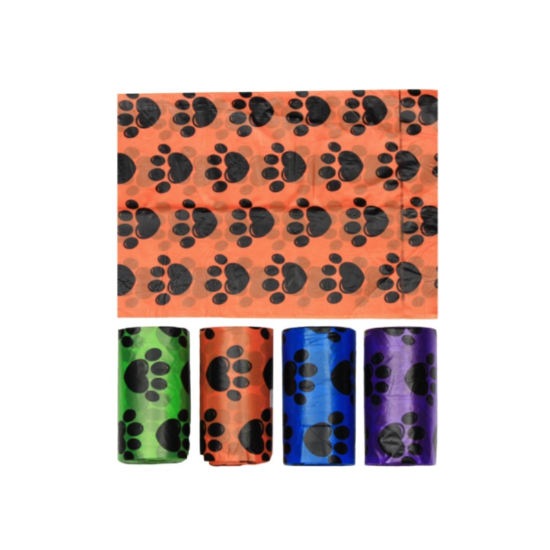 Waste BagsThe Multipet waste bags make cleanup a breeze. These durbable bags feature Paw prints and come in orange, green, purple, and blue. 2-pk includes a waste bag holder. 15 bags per roll.