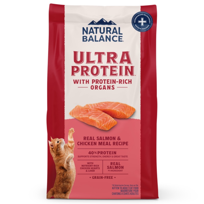Natural Balance Ultra Protein Real Salmon & Chicken Meal Recipe is formulated specifically for cats with our veterinary and nutrition experts to maximize protein, taste and nutrition for even the pickiest eaters. Each delicious bite of this salmon cat food is made with protein-rich organs for cats, like chicken liver & chicken hearts and is complete and balanced to give your cat the energy and taste they crave.