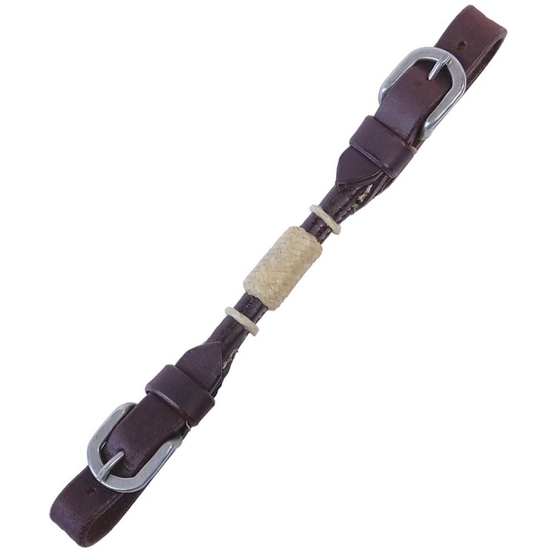 Leather curb strap with natural rawhide braiding. Adjustable buckles on both ends.