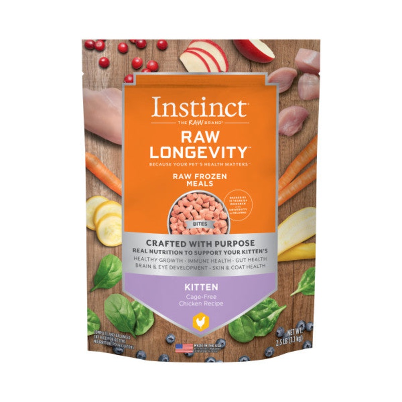 Complete & Balanced StatementInstinct Raw Longevity Raw Frozen Meals Cage-Free Chicken Recipe for Kittens is formulated to meet the nutritional levels established by the AAFCO Cat Food Nutrient Profiles for growth.Storage InstructionsKeep frozen until your pet’s mealtime. Bites thaw in minutes and should be cold to the touch when served. Wash hands, working surfaces, utensils, bowls and any other items that come in contact with raw meat or poultry with hot, soapy water. If your pet does not consume all the food presented within 30 minutes, discard any leftovers. Keep package sealed to maintain freshness.