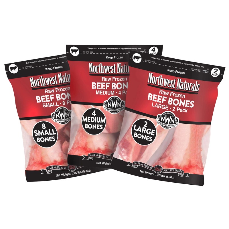 Beef Bones Now even bigger than everSmall Pack of Bones 8 per packageMedium Pack of Bones 4 per packageLarge Pack of Bones 2 per packageRaw meaty bones may be added to your pets daily diet as a treat or a snack.Bones should always be given with supervision