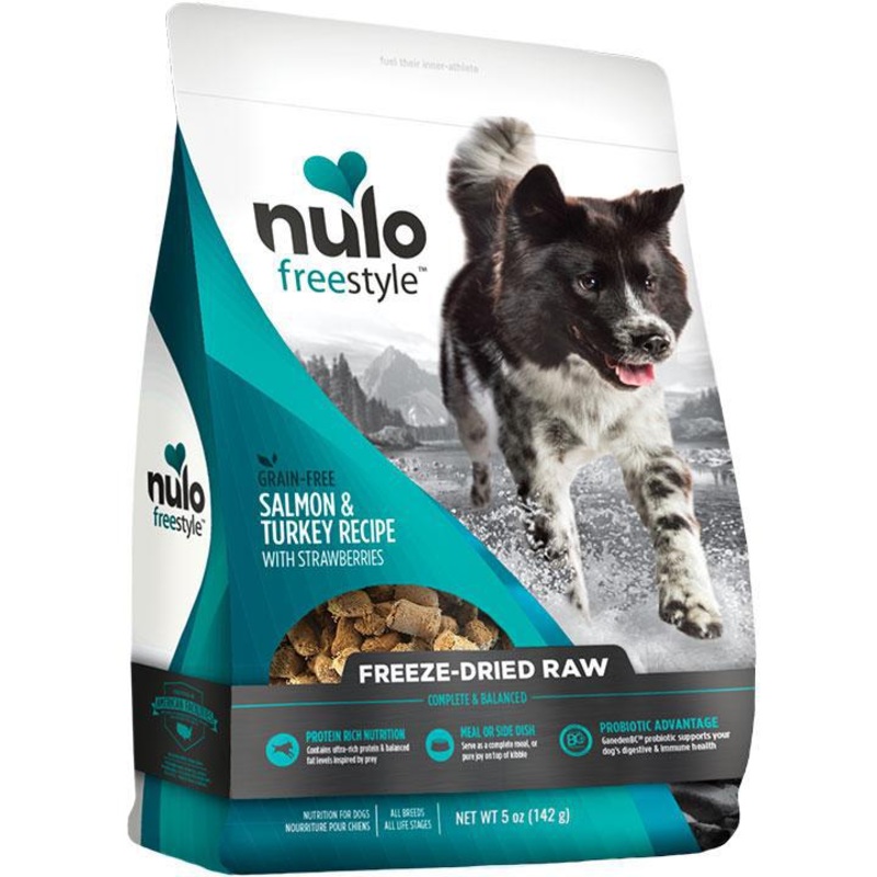 Give your dog a nutrient rich food Nulo Freestyle Freeze Dried Salmon recipe. Featuring 83% salmon, turkey, organs and bones and 7% of ingredients include wholesome vegetables and fruits such as strawberries, pumpkin, blueberries, kale and spinach. This food provides the nutritional benefits of raw, but with the added convenience of not needing to freeze or thaw. Nulo uses whole food nutrition and selects high quality ingredients which are minimally processed and then formed into bite sized pieces and quickly frozen to ensure nutrient and flavor retention. This recipe is proudly made in the USA at a USDA inspected facility.